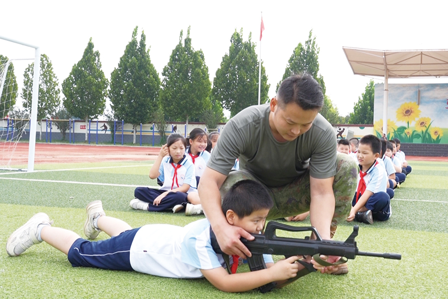 9月1日,茌平区胡屯镇中心小学内,教官在指导学生进行卧姿握枪课目练习。该校通过开展国防教育主题活动,引导学生增强国防观念,涵养家国情怀。记者 白文斌 通讯员 牛雪月 摄