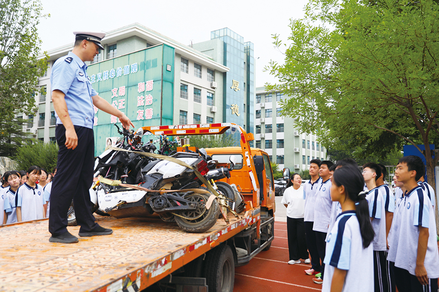 8月29日,聊城市公安局交管支队城区直属大队走进聊城颐中外国语学校高中部,为学生们送上一堂趣味性与实用性兼具的交通安全课。图为民警展示违规改装的摩托车。 记者 郝锐 摄